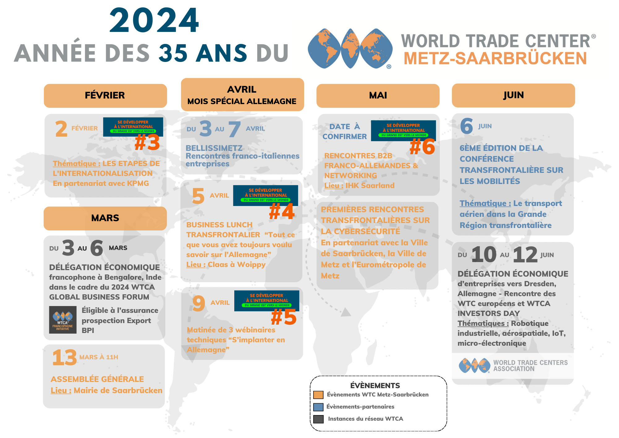 Nous célébrerons en 2024 les 35 ans du World Trade Center Metz-Saarbrücken et vous ferons bénéficier d’une programmation riche et variée, avec de nombreux événements en Allemagne, en France et à l’international. Des formats très différents seront organisés, notamment sur les thématiques de la cybersécurité, de l’internationalisation des entreprises et du transport aérien.