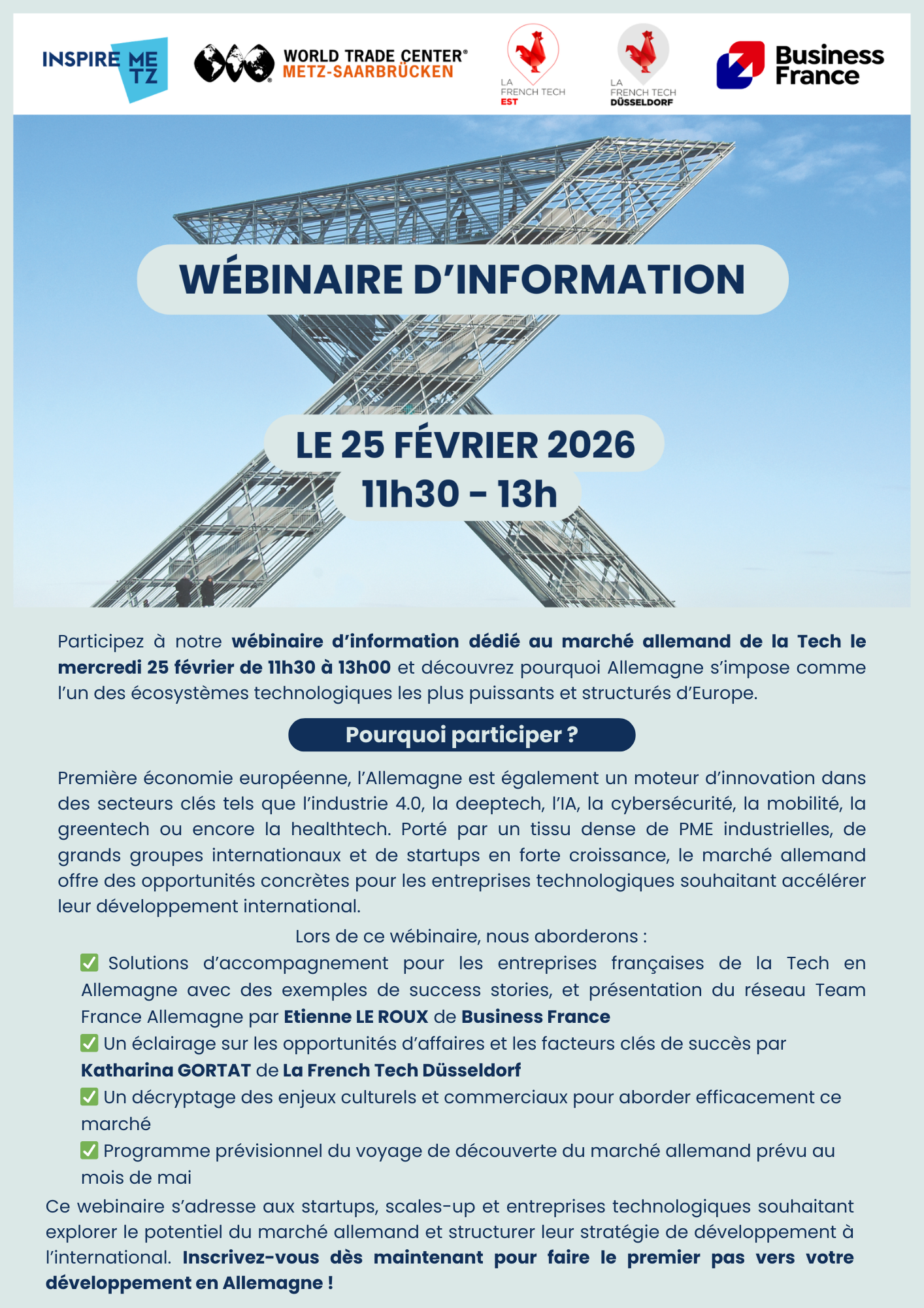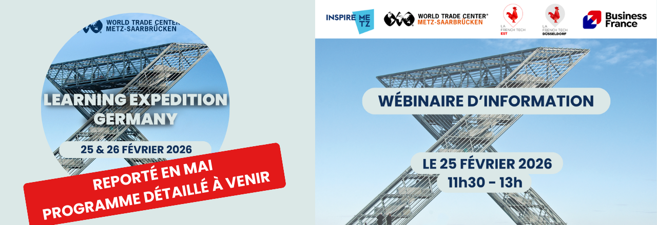 Le World Trade Center Metz-Saarbrücken, en partenariat avec Inspire Metz, l’agence d’attractivité de l’Eurométropole de Metz, et gwSaar, l’agence d’attractivité et de développement économique de la Sarre, vous propose une Learning Expedition exclusive en mai 2026, deux jours de découverte du marché allemand et de ses opportunités.